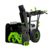 The EGO POWER+ 24 in. Self-Propelled 2-Stage XP Snow Blower with Peak Power™ exceeds the power and performance of gas without the noise, fuss, and fumes. This 24-inch two-stage snow blower features heated handle grips to help keep your hands warm in the coldest, snowiest conditions and trigger-controlled steering assists with turning for more control. Its handle-mounted 2-in-1 chute adjustment lever directs and deflects snow where you need it with 200-degree directional control for efficient snow removal. With Peak Power+ technology, this cordless snow blower combines the power of any two EGO 56V ARC Lithium™ batteries to churn through the toughest snow conditions and what the snowplow leaves behind with ease—and throws it up to 50 feet. Clear up to a 24-car driveway with 8 inches of snow on a single charge when used with two included 10.0Ah ARC Lithium™ batteries.