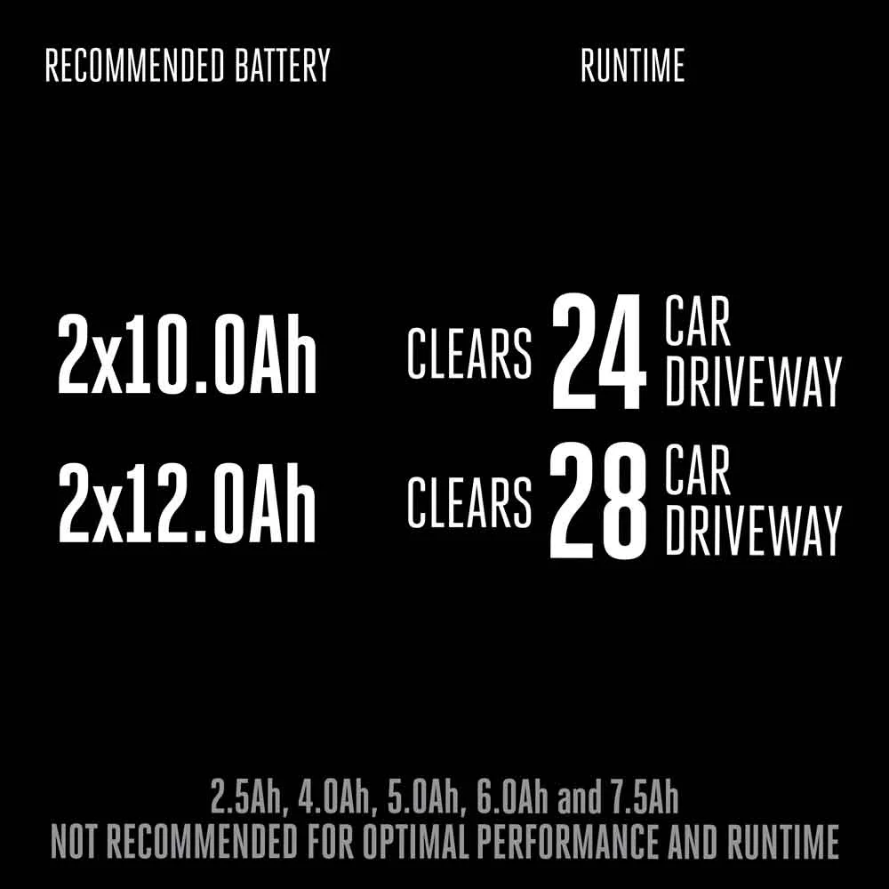 - Clears up to a 24-car driveway with 8 inches of snow on a single charge when used with two included 10.0Ah ARC Lithium™ batteries