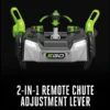 - 2-in-1 remote chute adjustment lever delivers 200-degree chute rotation and deflection control