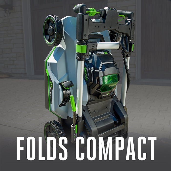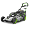 The EGO POWER+ 21″ Select Cut™ XP Self-Propelled Mower delivers up to 8.3 foot-pounds of torque that exceeds the power of gas without the noise, fuss, or fumes. The Select Cut™ Multi-Blade Cutting System is equipped with three interchangeable lower blades: the Mulching Blade, High Lift Bagging Blade, and Extended Runtime Blade. The Mulching Blade comes installed on the lawn mower and is ideal for weekly mulching, giving you the mulching quality expected from a high-end gas lawn mower. The High Lift Bagging Blade provides extra suction ideal for bagging, leaving your yard free of clippings. The Extended Runtime Blade provides an optimal balance of cut quality and runtime for all around performance. All three blades can be used interchangeably based on your desired cut. The Upper Blade is used in combination with the lower blade chosen to slice the grass into fine fragments, greatly enhancing cutting performance with all grass types. EGO Touch Drive™ self-propelled technology puts complete control of the self-propel system in the palm of your hands by using pressure to engage the system. Easily control the variable speed with a dial positioned at your fingertips for safe and convenient operation. The Select Cut™ XP cordless lawn mower harnesses the power of the industry’s most advanced 56V ARC Lithium™ batteries to deliver up to 75 minutes of runtime on a single charge with the recommended 10.0Ah battery. Three-in-one functionality delivers your choice of mulching, side discharge, or bagging your grass clippings; an easy-access two-bushel grass collection bag is included. This electric lawn mower includes bright LED lights for added visibility when mowing at dawn or dusk, and it folds for compact storage between cuts. Experience Power Beyond Belief™ with the EGO POWER+ 21″ Select Cut™ XP Self-Propelled Lawn Mower.