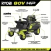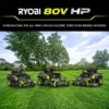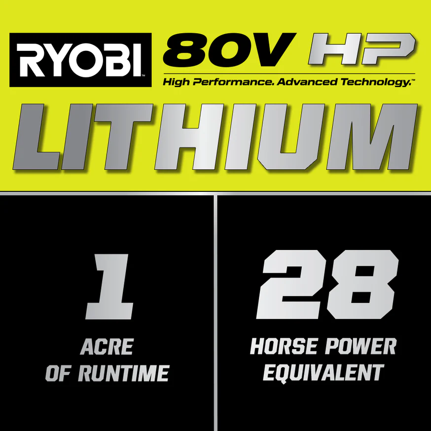 Introducing RYOBI’s first lithium-ion battery powered zero turn riding mower, the RYOBI 80V HP Brushless 30″ Lithium Electric ZTR.* HP Technology and 80V batteries combine to deliver the power equivalent of a 28 horsepower gas engine*, while eliminating the hassle and maintenance of a gas mower. This rider cuts up to 1 acre per charge with the help of 4 brushless motors and (2) 80V 10Ah batteries, with a Super Charger that fully recharges in 1.5 hours so you’re ready for your next job. The revolutionary iDrive system uses an intuitive one-handed joystick steering to maneuver around objects more easily than a traditional ZTR. The innovative LCD screen displays runtime, battery life, and more, while the Riding Mower app allows you to monitor charge time and battery life remotely. The 12-point height adjustment allows you to select the perfect cutting height between 1.5″ and 4.5″. This mower continues to lead innovation with the compatible Bagger Boost accessory, which quickly clears the chute with the press of a button. The 30″ deck and rubber side discharge chute allow this rider to fit through a standard 36″ gate, and makes it easy to maneuver around landscaping. Designed with comfort and convenience in mind, this mower features a premium seat, a USB port to charge phones, a storage compartment, and LED headlights. Lawn maintenance will never be the same thanks to the RYOBI 80V HP Brushless 30″ Lithium Electric Zero Turn Riding Mower.